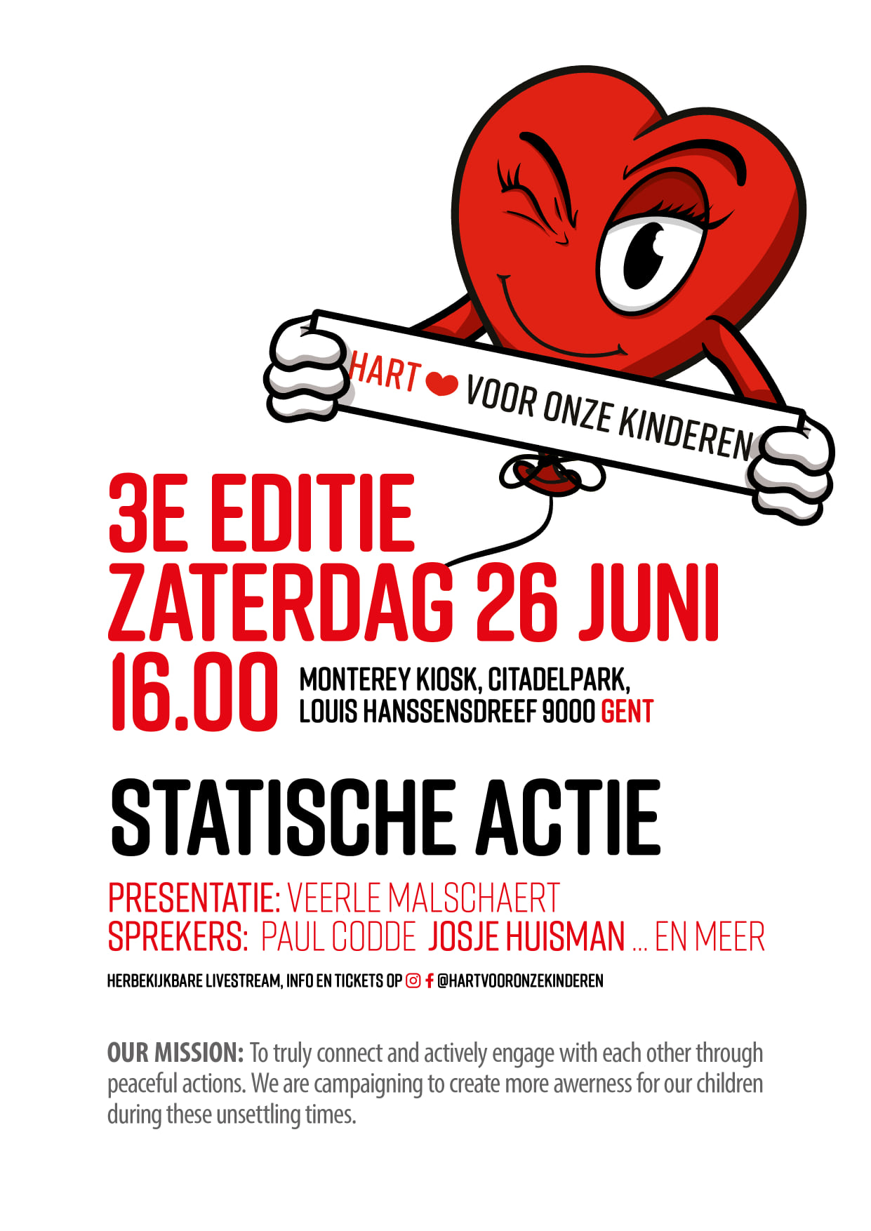 "Vol nieuwe moed en een warm hart voor alle kinderen." HART VOOR ONZE KINDEREN plande in het najaar van 2022 een NIEUWE statische actie op zondag 20 november 2022 om 15u in het Citadelpark Gent naast de Monterey Kiosk aan het Amfitheater. HERBEKIJK HIER
